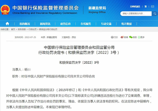 7月25日,银保监会和田银保监分局发布行政处罚决定书(和银保监罚决字〔2022〕3号)显示,根据中国银保监会授权,针对中国人民财产保险股份有限公司(以下简称:人保财险)民丰支公司员工挪用保险费进行赌博的违法违规行为,对该支公司罚款20万元,对当事员工杨某作出禁止终身进入保险业的处罚。