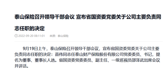 9月20日,泰山财险官网显示,该公司召开领导干部会议,宣布省国资委党委关于公司主要负责同志任职的决定,苗伟任泰山财产保险股份有限公司党委委员、书记,提名为董事、董事长人选。