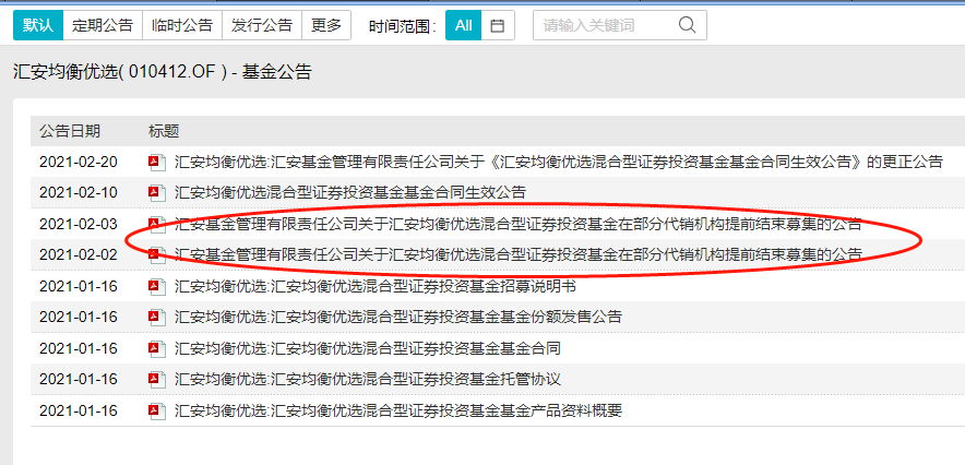 公开信息显示,汇安均衡优选混合2月1日开始发售,2月3日宣布提前结束募集。