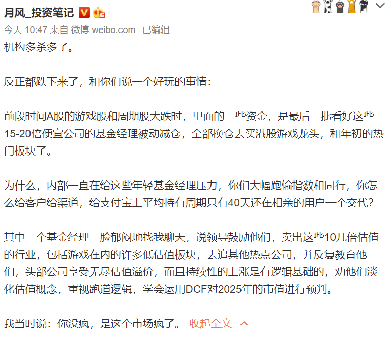 其中一个基金经理一脸郁闷地找我聊天,说领导鼓励他们,卖出这些10几倍估值的行业,包括游戏在内的许多低估值板块,去追其他热点公司,并反复教育他们,头部公司享受无尽估值溢价,而且持续性的上涨是有逻辑基础的,劝他们淡化估值概念,重视跑道逻辑,学会运用DCF对2025年的市值进行预判。