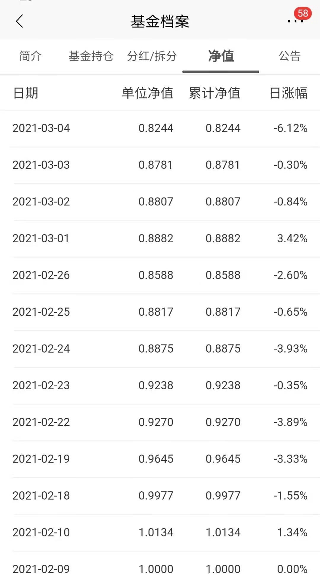 具体是怎样的?我们来看看净值表现,2月9日开始基金生效,10日净值增长1.34%,随后就过上春节,春节回来之后分别在19日、26日公布净值,一下子就回撤到了0.8588,要知道,节后到26日,一共才6个交易日,就跌去了15%!