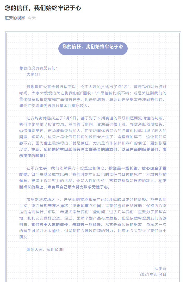 汇安均衡优选成立于2月9日,基于对于长期赛道的看好和短期流动性的判断,我们坚定地做了投资布局。然而春节期间,资源品价格上涨,导致通胀预期抬头,恐慌情绪蔓延,市场波动突然加大,汇安均衡优选混合的净值也因此出现了较大的回撤。短期内,这只产品让信任我们的投资者产生了一定程度的浮亏,这让我们深感不安。因为世上最难得的,就是信任,尤其是合作伙伴和客户的信任,更加弥足珍贵。 在此,我们向所有因此而关注汇安基金的朋友们、以及产品的投资者们,表示深深的歉意!