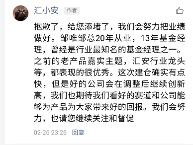 面对持有人的种种质问,一位认证为“汇小安”做出官方回应——“首先给大家道个歉,我们的基金给大家添堵了。大家买了汇安基金,就是我们的客户,我们会负责到底。”