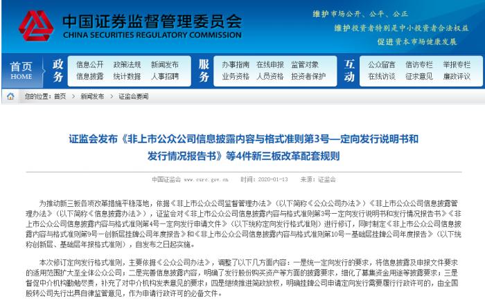 1月13日,证监会为推动新三板各项改革措施平稳落地,依据《非上市公众公司监督管理办法》(以下简称《公众公司办法》)《非上市公众公司信息披露管理办法》(以下简称《信息披露办法》),证监会多个配套披露格式进行了修订,自发布之日起实施。