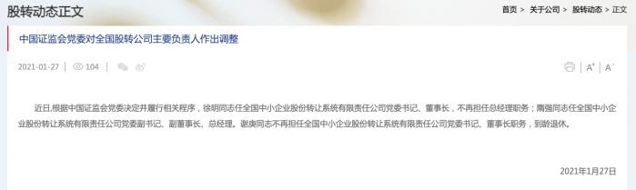 近日,全国中小企业股份转让系统(以下简称股转公司)在其官网发布公告称,根据中国证监会党委决定并履行相关程序,谢庚不再担任股转公司党委书记、董事长职务,到龄退休。转由徐明出任党委书记、董事长,不再担任总经理职务;隋强出任党委副书记、副董事长、总经理。