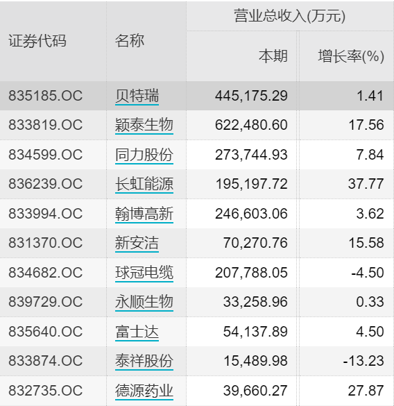 业绩佼佼者有:颖泰生物为目前营收最高的精选层企业,2020年实现62.25亿元营收,同比增长17.56%。