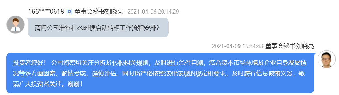 在上周五(4月9日)举办的精选层企业首场集体业绩说明会上,颖泰生物、创远仪器、齐鲁华信等5家企业与会。多家企业负责人回复了投资者关于公司是否有转板计划、转板筹备情况等的提问。