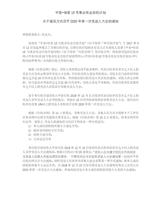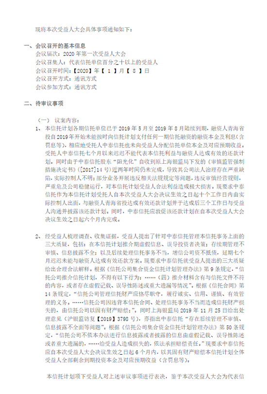 中泰信托兑付纠纷后续 受益人代表宣布依法自行召开受益人大会