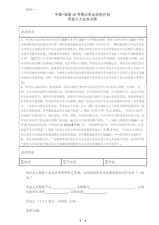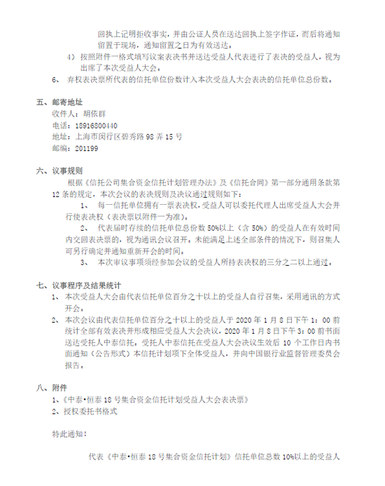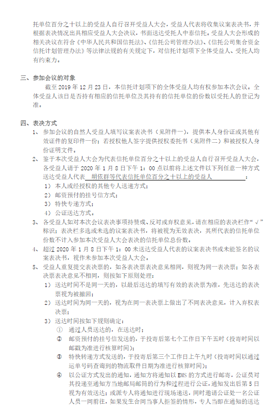 依照此条规定,超过10%份额的受益人于2019年12月5日向中泰信托提出书面申请,要求召开受益人大会。