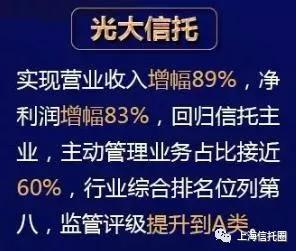 此外,光大信托虽然未披露详细数据,但根据中国光大集团披露显示,光大信托2019年实现营业收入增幅达89%,净利润增幅83%。回归信托主业,主动管理业务占比接近60%,行业综合排名前十,监管评级提升到A类信托公司。