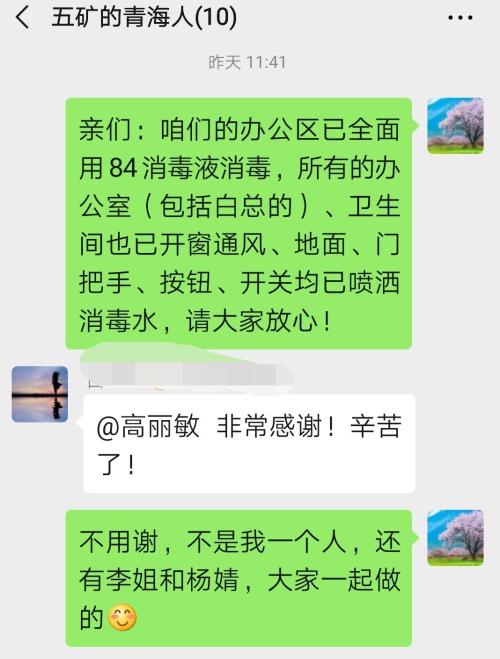 与此同时,青海办公区综合管理部和党群工作部的三名值班人员,高丽敏、李华、杨婧也纷纷从自己家里拿来了84消毒液,他们主动对青海办公区所在楼层做了初步的消毒处理,大到办公室的清洁、卫生间开窗通风,小到每一个门把手、门禁开关、电梯按钮,他们知道,在这样的特殊时期,自己多一分用心,同事的安全就会多一份保障。
