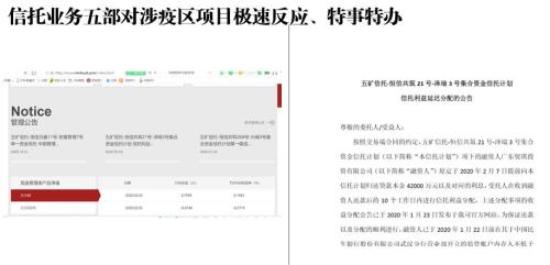 同样受疫情影响,原定于2月7日提前还款分配的某信托项目无法在原定期限内完成。信托业务五部相关同事在春节期间积极联系项目的监管行和融资人相关同事(均于武汉市工作),了解当地疫情最新情况和政府工作安排,沟通融资人和代销行对投资人进行相应的解释,并在2月3日复工当天发布了信托利益延迟分配的公告。