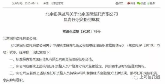 上海信托网消息,2月14日,自银保监会官网获悉,北京国际信托拟任昌青为副总经理的申请获得批复。批复显示,北京银保监局根据有关规定,核准昌青北京国际信托副总经理的任职资格。
