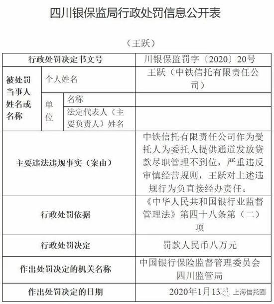 上海信托网消息,1月20日,四川银保监局官网披露中铁信托被处罚信息。