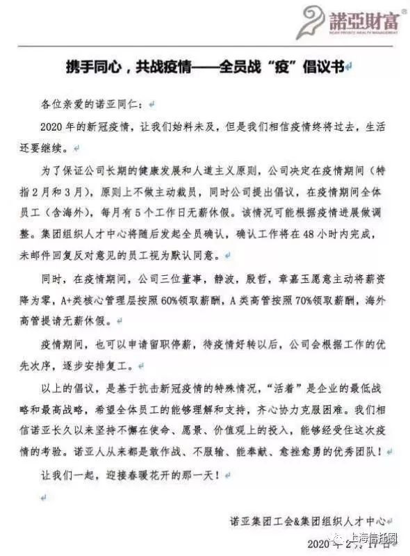 2月17日,网传一份诺亚财富(NOAH.US)向全体员工下发的全员战“疫”倡议书。该倡议书中提到,公司决定在当前(特指2月和3月),原则上不做主动裁员,同时公司提出倡议,在此期间所有员工(含海外),每月有5个工作日无薪休假。