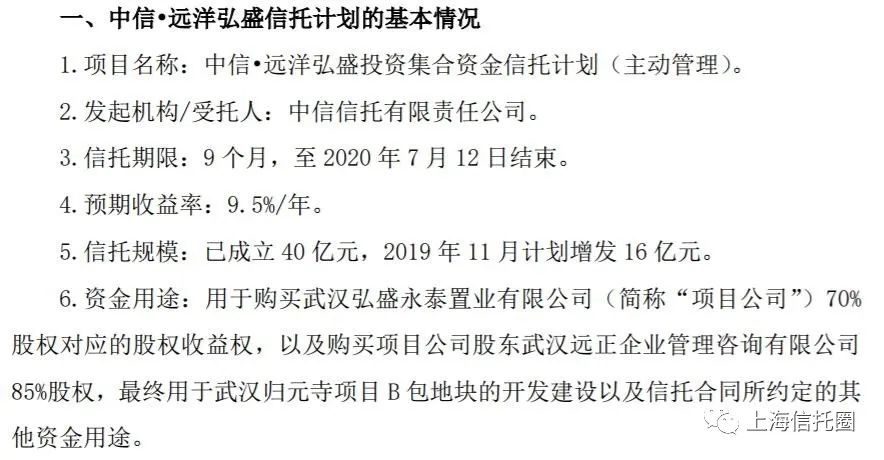 融资方:武汉远洋地产声明中信·远洋的融资方弘盛永泰置业与中信信托签署的中信·远洋信托计划已于2019年7月12日全额结清该信托计划本息。
