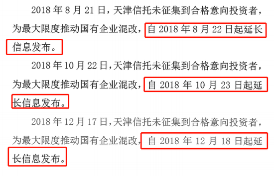 据海泰控股公告显示,天津信托自发布混改方案后,均因未征集到合格意向投资者,曾经三次延长信息发布时间。2019年1月16日,天津信托更是拟将混改项目从天津产权交易中心撤牌。