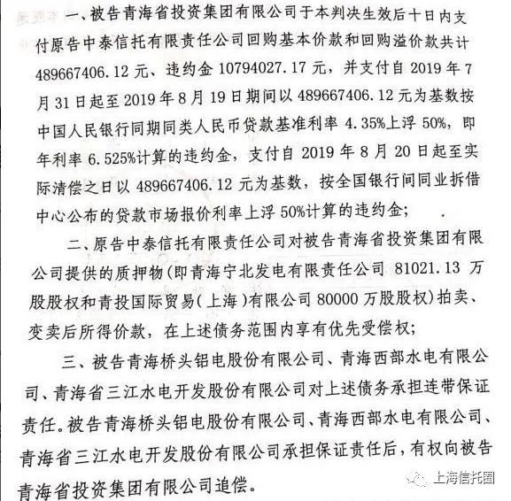 导读:2019年3月29日,中泰信托将青海省投告上法庭。近日,一审判决结果出炉,西宁市中级人民法院判令被告青海省投支付回购基本价款及回购溢价款4.90亿元。