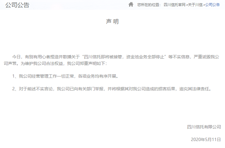 今日,有别有用心者捏造并散播关于“四川信托即将被接管,资金池业务全部停止”等不实信息,严重诋毁我公司声誉。为维护我公司合法权益,我公司郑重声明如下: