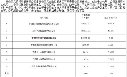据公开资料显示,国元信托目前股东共7家,持股比例前3位的股东分别为安徽国元金融控股集团有限责任公司,持股49.6875%;深圳中海投资管理有限公司,持股40.375%;安徽皖投资产管理有限公司持股9%,其中,安徽国元金融控股集团有限责任公司和安徽皖投资产管理有限公司为国有独资公司。