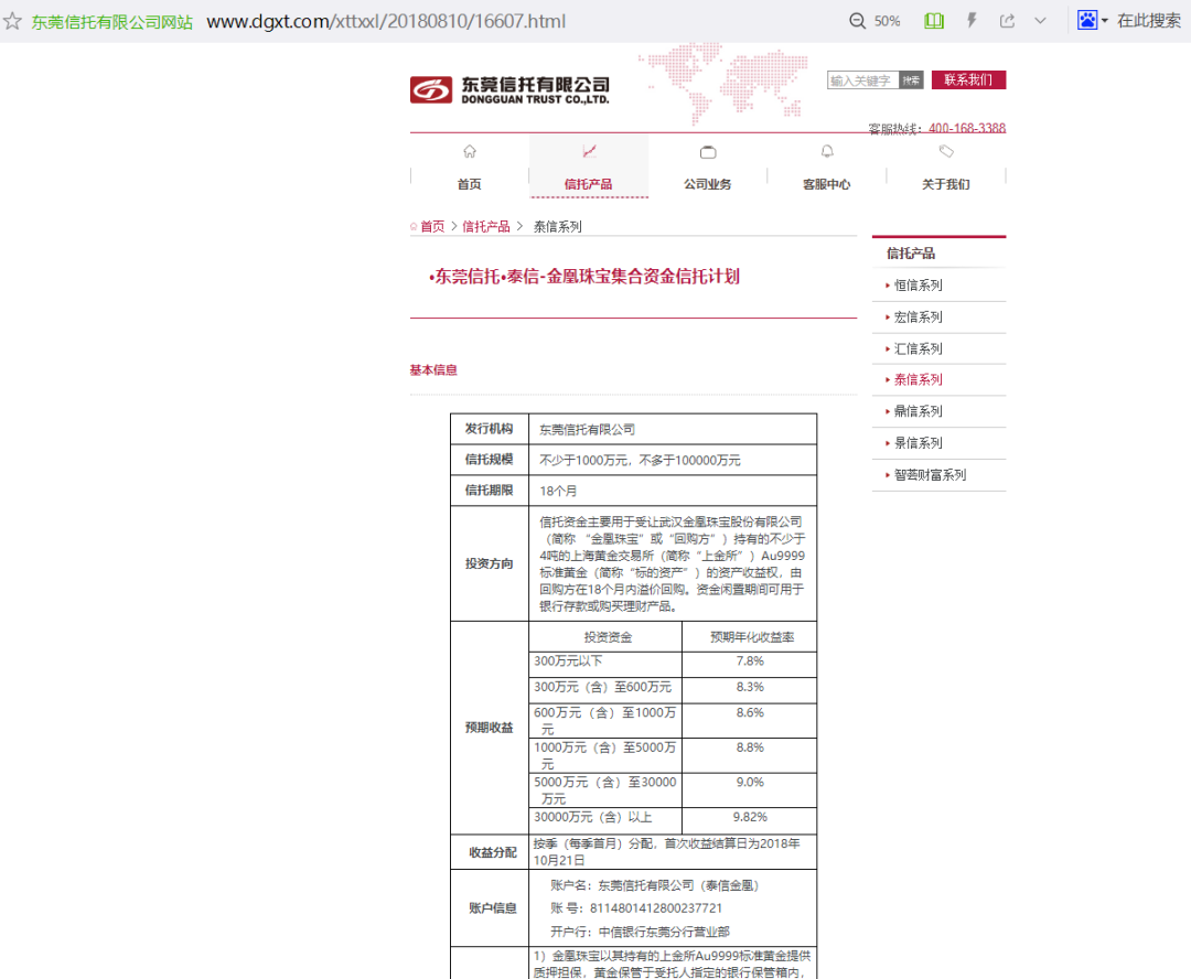 2018年8月10日发行“东莞信托·泰信-金凰珠宝集合资金信托计划”(下称本信托计划),本信托计划已完成有关法律文件签订及委托人缴款工作,信托资金人民币40000万元。