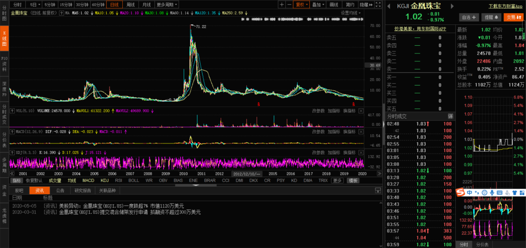 根据公司网站介绍,武汉金凰珠宝股份有限公司成立于2002年8月,于2007年10月整体变更为股份公司,2010年8月18日成功在美国纳斯达克上市,股票代码:KGJI。金凰珠宝集研发设计生产、制造、批发于一体的大型黄金首饰生产企业,是国内较大的黄金首饰制造商之一,黄金涨,股票跌,和上面的A股完全不一样,真是有点奇怪。