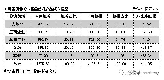 另据不完全统计,截至4月30日,4月共计成立集合信托产品2285款,与上月同时点相比减少6.35%,成立规模1871.27亿元,与上月同时点相比减少12.05%。