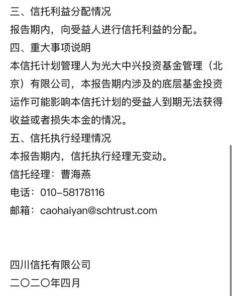 4月末,四川信托向投资人发送了旗下四川信托·光大中兴蛮子1号股权投资集合资金信托计划(以下简称“蛮子1号信托”)2020年一季度运作报告。报告在重大事项一栏提示称,“蛮子1号信托计划在2020年一季度内涉及的底层基金投资运作可能影响信托计划的受益人到期无法获得收益或者损失本金的情况。