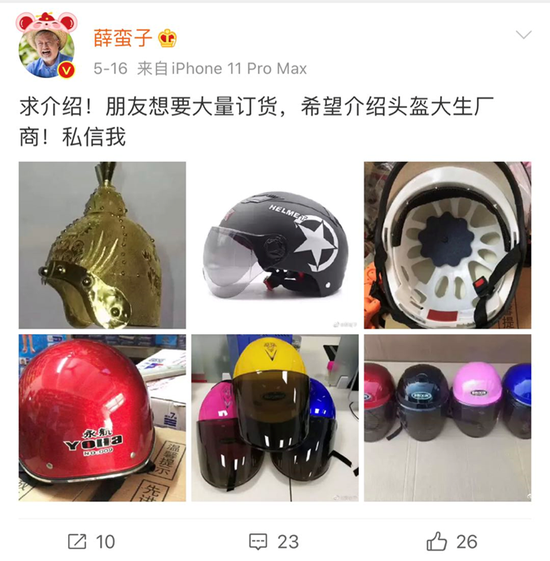 今年疫情期间,薛蛮子人不在国内,但心系疫情,很及时的变身为口罩“倒爷”,在微博上贩卖各种口罩。探长注意到,薛蛮子最新的投资方向是“头盔”。5月16日,薛蛮子在微博发文称,“求介绍,朋友想要大量订货,希望介绍头盔大生产厂商!私信我”。