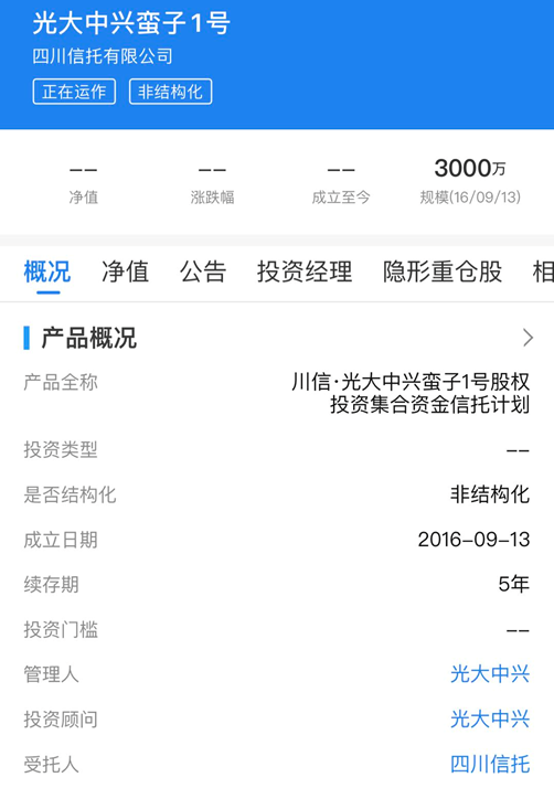 企业预警通信息显示,“蛮子1号信托” 成立于2016年9月13日,存续期5年,规模3000万元,委托人共有26位。受托人为四川信托,管理人和顾问为光大中兴投资基金管理(北京)有限公司,信托基金经理为曹海燕。