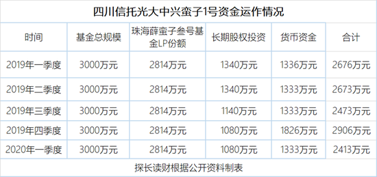 2020年一季度,基金长期股权投资为1080万元,货币资金减少至1333万元,基金规模合计2413万元。本期报告显示,该季度“蛮子1号信托”向受益人进行了信托利益的分配。