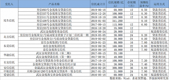 从产品到期时间来看,自2019年下半年起,民生信托发行的规模均为10亿元的至信537号、至信511号,规模达34.13亿元的439号在信托官网并未发布清算计划报告东莞信托4亿元的泰信金凰珠宝信托和长安信托10亿元的金凰3号贷款集合资金信托计划等按计划也已到期。