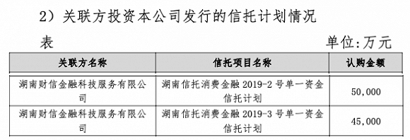 湖南信托2019年的年报显示,报告期内,其关联方湖南财信金融科技服务有限公司(下称 “湖南财信”)发行了湖南信托消费金融2019-2号单一资金信托计划和湖南信托消费金融2019-3号单一资金信托计划,规模各为5亿和4.5亿。通过信托计划输血助贷平台是信托参与消金业务的模式之一。
