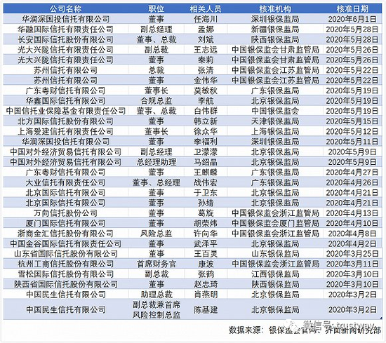 根据银保监会公布的核准公告,3月共有5家信托公司的6位高层任职人员获得核准,4月则有7家公司的8位相关人员获得核准,5月这一数据则增长至11家公司的14位高层。