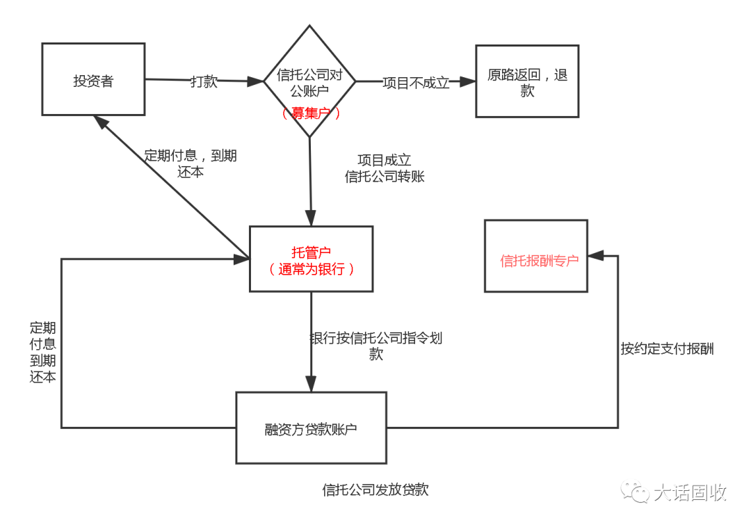 回想下信托打款的流程,投资者先把款转入信托公司开设在托管方的对公托管户,项目成立后,款项统一从托管户转入融资方贷款账户——这个转入操作是由银行按照《托管协议》来做的,信托公司只能下达指令。