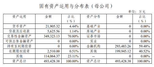 在固有资产分布中,金融机构占比59.48%,其他占比40.52%。而2018年固有资产分布中,证券市场占比23.75%,在2019年该数值为0。