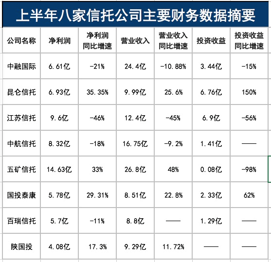 最近,随着上市公司披露中期业绩预告,信托公司也迎来了年中业绩大考。目前,已经有八家信托公司曝光了未经审计的上半年财务数据。