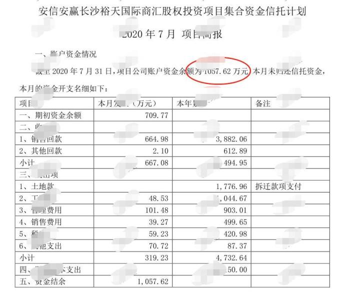 另外,裕天项目到期日为2019年10月19日,而投资者称,目前安信信托方面只兑付利息,本金部分尚未兑付。但是根据投资者所提供的裕天项目2020年7月份简报,截止7月31日,项目公司账户资金余额为1057.62万元。
