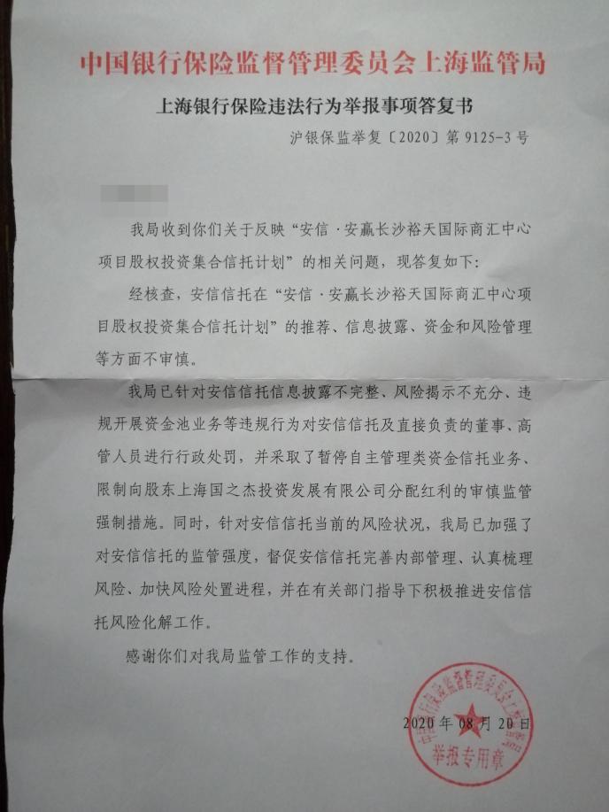 财联社(上海,实习记者 林汉垚)讯,8月20日,安信信托安赢长沙裕天国际商汇中心项目股权投资集合资金信托计划(以下简称“裕天项目”)投资者收到上海银保监局银行保险违法行为举报答复书(以下简称“答复书”)。