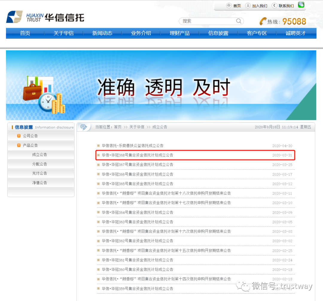 华信信托官网显示,该司最近一只集合信托产品成立于2020年3月31日,产品名称为华信·华冠368号集合资金信托计划,此后华信信托仅发布过一款慈善信托的成立公告。