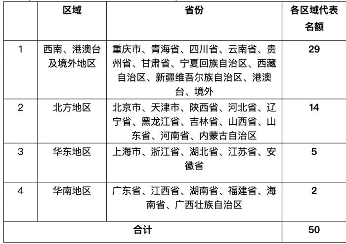 根据各区域TOT及资金池产品委托人分布情况(根据身份证号所在地划分区域),按人数比例确定代表名额,具体区域及名额分布为:西南、港澳台及境外地区(重庆市、青海省、四川省、云南省、贵州省、甘肃省、宁夏回族自治区、西藏自治区、新疆维吾尔族自治区、港澳台、境外)代表名额29位;北方地区(北京市、天津市、陕西省、河北省、辽宁省、黑龙江省、吉林省、山西省、山东省、河南省、内蒙古自治区)14位;华东地区(上海市、浙江省、湖北省、江苏省、安徽省)5位;华南地区(广东省、江西省、湖南省、福建省、海南省、广西壮族自治区)2位。