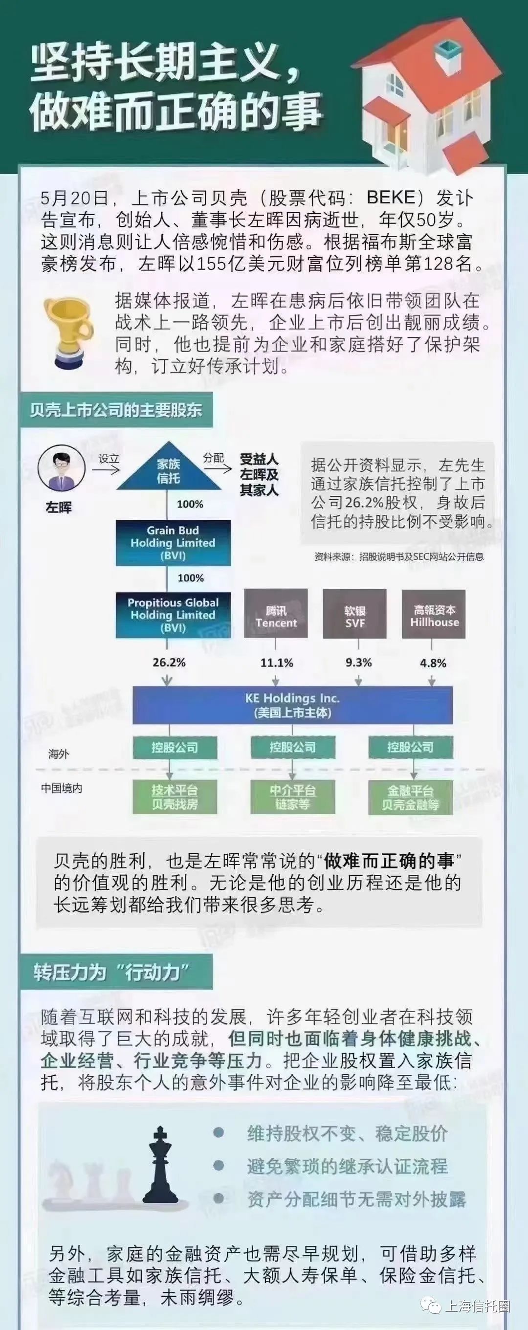 导读:他提前为企业和家庭搭好了保护架构,订立好传承计划。左晖通过家族信托控制了上市公司26.2%股权,身故后信托的持股比例不受影响。