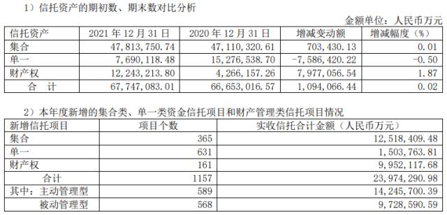 在信托资产管理方面,2021年集合、单一、财产管理权信托分别占70.57%、11.35%、18.07%,相比2020年分别上升0.01pct、下降0.5pct、上升1.87pct,