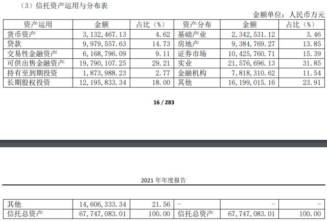 信托公司固有资产投向行业看,包括金融机构、证券市场、实业、房地产业、基础产业和其他产业。其中,金融机构始终是信托公司固有资产最主要的投向,2021年中航信托各项资产分布占比分别为基础产业1.87%,房地产业12.49%,证券市场15.77%,工商企业22.16%,金融机构29.64%,其他18.07%。相比去年,各类资产分布的变化是有增有减,表现比较突出的是,金融机构上升9.63%,房地产上升5.85%,投向下降最多的是其他,下降8.81%,其次是实业,下降8.35%,据悉,2020年中航信托固有资产投向实业规模在行业内排名第四。