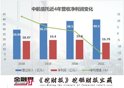 近日,中航产融(600705.SH)发布了2021年年报,旗下中航信托的业务情况同步披露。年报显示,中航信托手续费及佣金收入为39.55亿元,同比上升3.37%。实现营业收入40.1亿元,同比增长4.07%;净利润16.79亿元,同比下降15.24%。