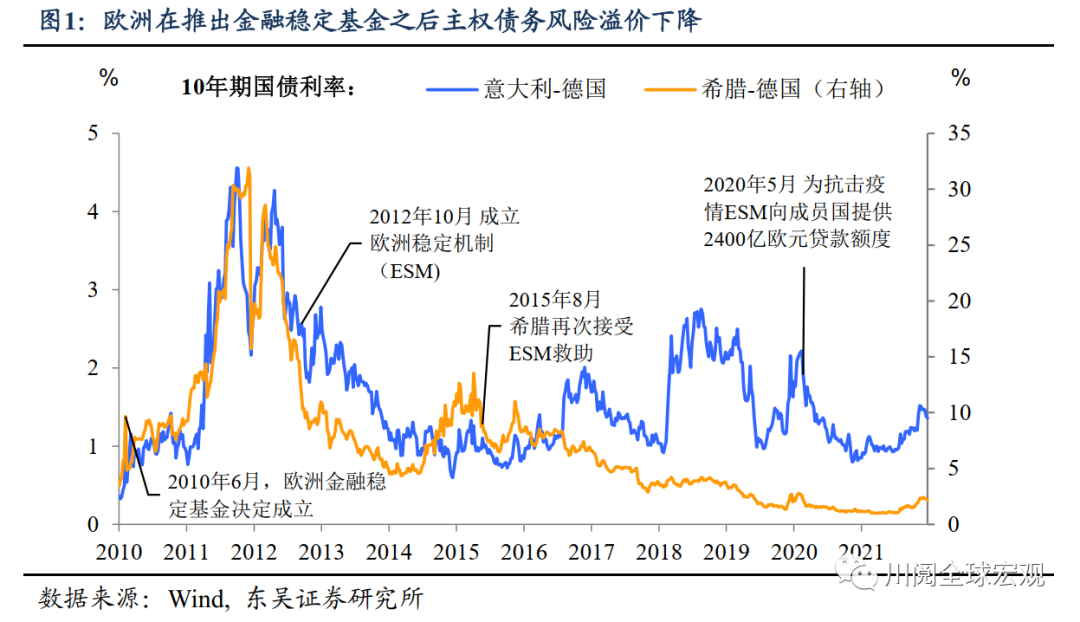 欧洲稳定基金(包括之后的欧洲稳定机制)的推出降低了欧盟成员国主权债务风险和溢价水平。在欧洲金融稳定基金(EFSF)之后,2012年10月欧元区成立永久性的“防火墙”欧洲稳定机制(ESM),用于救助陷入金融困境的成员国。尽管真正出手的次数并不多,但是金融安全网的完善带来了欧洲国债市场风险溢价中枢的明显下降(一般将德国国债利率视为欧洲的无风险利率)。
