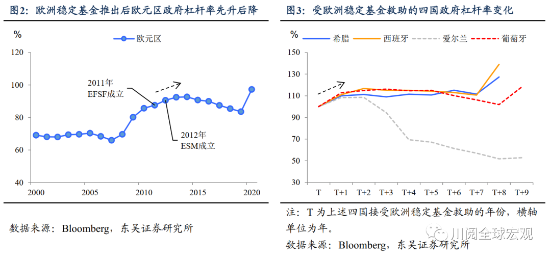 欧洲稳定基金推出后,政府杠杆率先升后降。2020年之前,EFSF和ESM共向5个成员支付了2950亿欧元(爱尔兰、西班牙、葡萄牙、塞浦路斯和希腊),在稳定基金的帮助下,这些国家成功走出了金融困境,重新获得金融市场的信任、能够以更低的利率水平进行融资。不过从政府杠杆率来的变化来看,无论是欧元区还是接受救助的国家都经历一个先升(一般持续2年)后降的过程,这可能反映了这些经济体利用稳定基金创造的金融环境加杠杆稳经济,最终走出困境的过程。