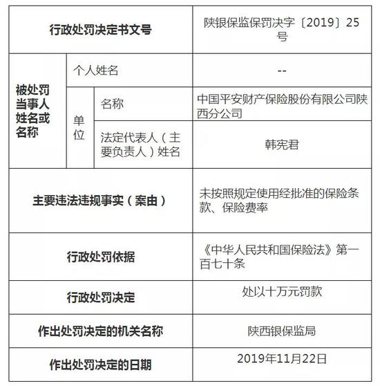 具体来看,中国平安财产保险股份有限公司(以下简称“平安财险”)陕西分公司因存在未按照规定使用经批准的保险条款、保险费率,被陕西银保监局处以10万元罚款,责任人被警告并罚1万元。