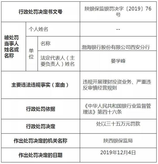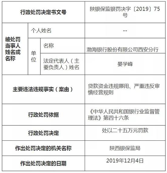 根据陕西银保监局公布的行政处罚信息公开表,依据《中华人民共和国银行业监督管理法》第四十六条,陕西银保监局对渤海银行西安分行分别罚款35万元与25万元,合计罚款60万元。
