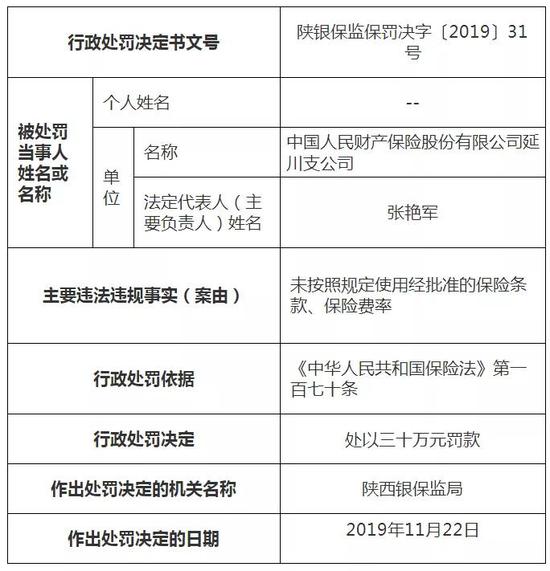 同样的,根据陕西银保监局行政处罚信息公开表(陕银保监保罚决字〔2019〕29、30号),中国太平洋财产保险股份有限公司(以下简称“太平洋财险”)西安中心支公司存在未按照规定使用经批准的保险条款、保险费率的违法违规事实,被罚款20万元。